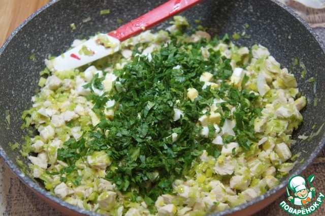 Петрушку вымыть, стряхнуть воду, мелко нарезать. Смешать в миске лук с курицей, яйца, сыр и петрушку, посолить, поперчить по вкусу.