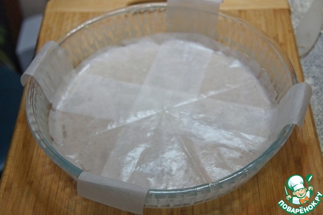 Выложить в форму 7 слоев теста, смещая их относительно друг друга и каждый смазывая сливочным маслом. Концы должны равномерно свисать по краям формы, полностью их покрывая.