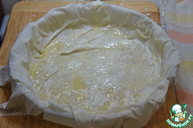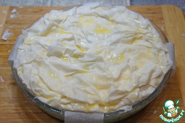 Тесто фило можно заменить бездрожжевым слоеным тестом, в этом случае в пироге будет 2 слоя.