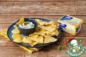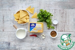 Установите мисочку в центр блюда, вокруг разложите начос. Украсьте сырный соус кинзой и подавайте.
