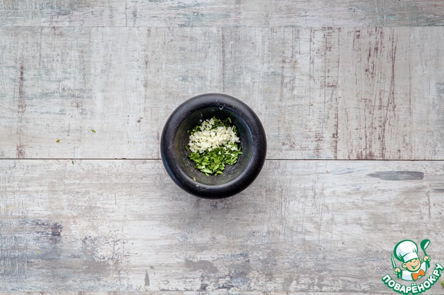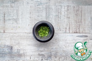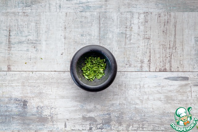 Хорошенько промойте корешки кинзы – там часто прячется песок. Отложите примерно треть листьев для украшения, оставшуюся кинзу мелко порубите и сложите в ступку.
