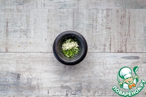 Очистите и измельчите чеснок, добавьте к кинзе.