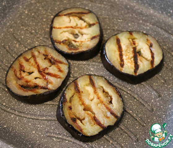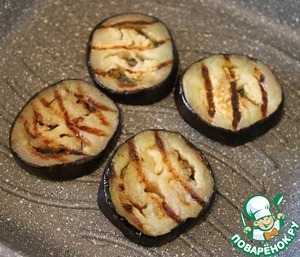 Баклажаны нарезать кружочками. Обжарить на сковороде грилль с маслом (можно на обычной сковороде, затем выложить на бумажные полотенца, чтоб избавиться от излишков масла.)