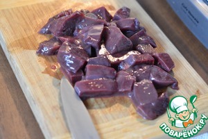 Печень помыть, удалить пленки и нарезать на небольшие кусочки.