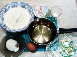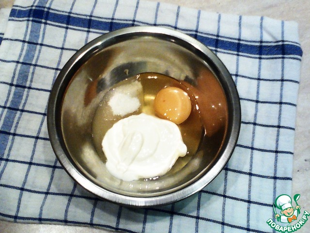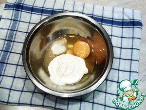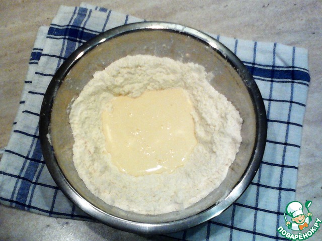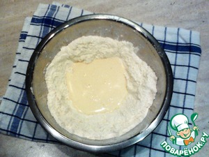 Сделать углубление, влить сметанно-яичную массу и замесить тесто.