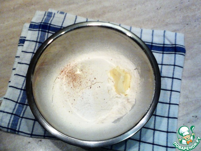 В другой миске соеденить просеянную муку, ванилин (я ещё добавила мускат. ореха люблю его в выпечке), соду, разрыхлитель и сливочное масло. Руками превратить в однородную сыпучую массу.