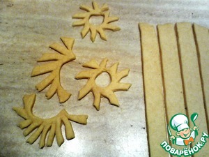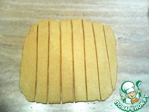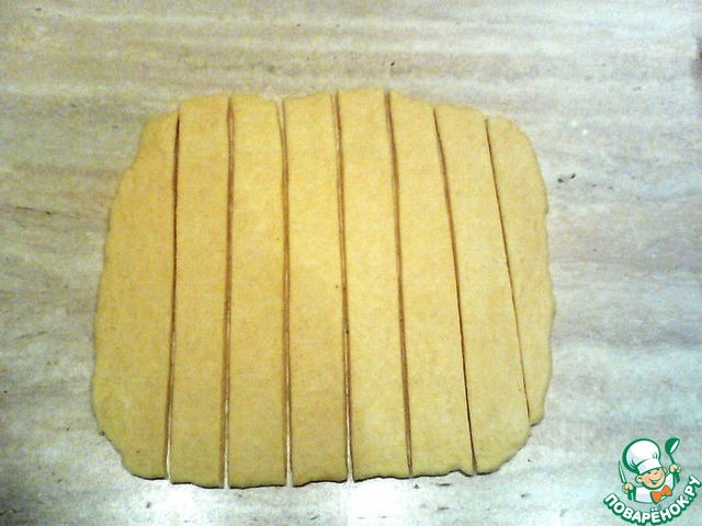 Далее раскатать тесто в пласт толщиной в 0.5 см или чуть тоньше. Нарезать на полоски шириной около 2-3 см.