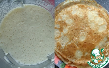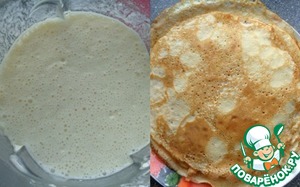Слоеное тесто разморозить. Завести тесто на блины: все ингредиенты поместить в чашу блендера и взбить в течении двух минут. Дать тесту отдохнуть 20-30 минут. Выпечь блины.