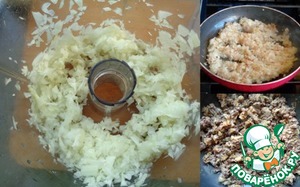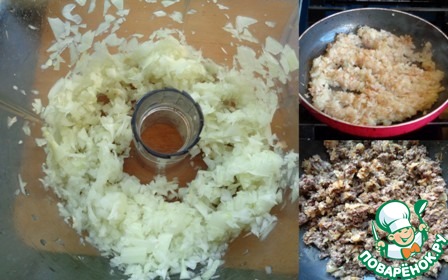 Лук измельчить, пожарить на растительном масле до зарумянивания, добавить фарш, соль, перец, чеснок. Жарить до готовности фарша.