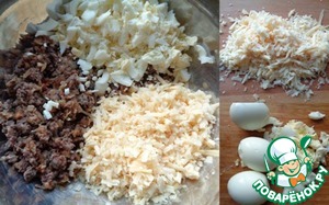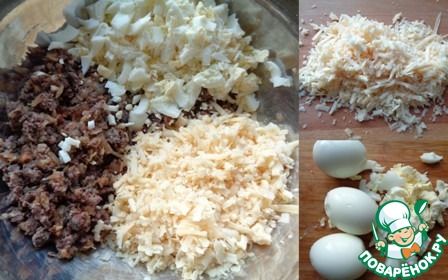 Подготовить начинку: яйца отварить, порезать. Сыр нашинковать. В поджаренный фарш добавить яйца и сыр.
