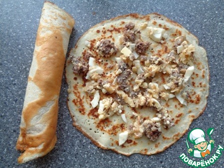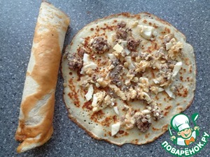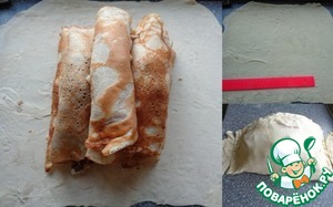 Блины нафаршировать: на каждый блин положить фарш и скрутить рулетиком. У меня получилось 10 блинных рулетиков.