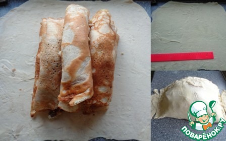 Слоеное тесто раскатать, у меня пласт 40 х 35 сантиметров. В середину положить горкой блинные рулетики. Тесто соединить, с двух сторон, поверх блинов, защипать края. Лишнее тесто обрезать по двум другим сторонам и тоже защипать.