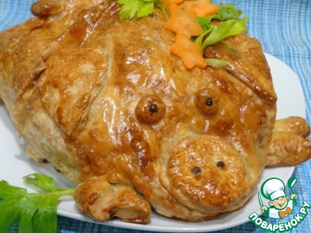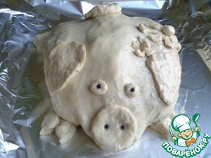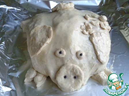 Смазать поросёнка яйцом. Выпекать при температуре 180 градусов 30 минут. Поросёнок сильно деформировался, я думаю из-за того, что я использовала нежное слоеное тесто. Считаю, что лучше воспользоваться дрожжевым сдобным тестом, оно не будет так деформироваться при выпечке.