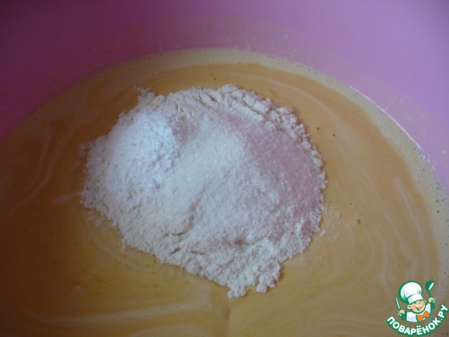 Всыпать муку со смешанным в ней разрыхлителем теста и ванильным сахаром. Снова все перемешать.