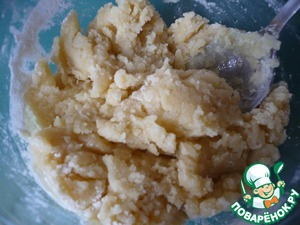 В жидкую массу добавить муку с разрыхлителем теста и щепоткой соли. Ложкой перемешиваем мягкое тесто.