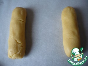 Приготовленное тесто разделить на две части. Противень застелить бумагой для выпечки и выложить тесто в форме колбасок.
