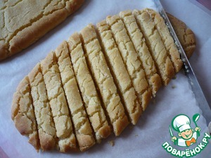 Достаньте противень из духовки и дайте печенью немного остыть, не снимая его с противня (оставьте минут на пять). А затем острым ножом нарежьте выпечку наискосок полосками.