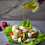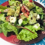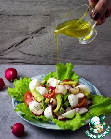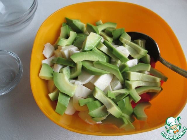 Кусочки авокадо перемешать с лимонным соком и добавить к овощам. Посолить по вкусу, добавить 2 -3 ст. л. оливкового масла и перемешать.