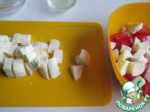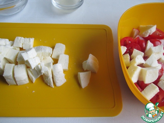 Моцареллу нарезать кубиком (или произвольно) и добавить в салатник.