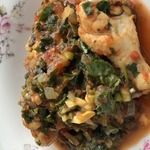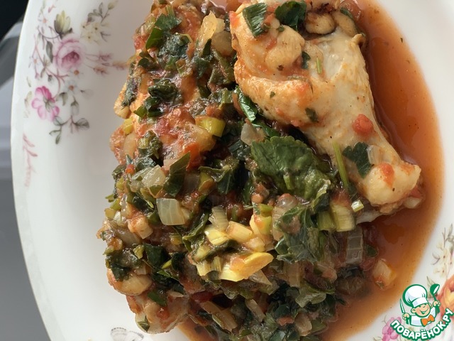 4. Зелень вымыть, обсушить, мелко нарезать. Чеснок очистить, измельчить. Добавить зелень, чеснок и хмели-сунели в сковороду с чахохбили. Посолить по вкусу. Подавать блюдо к столу горячим.