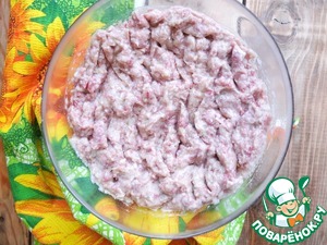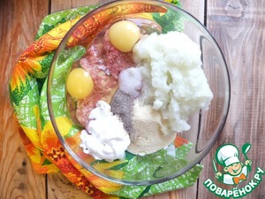 К фаршу (у меня свинина/говядина 50/50) добавляем яйца, сухари, сметану, лук, измельченный в блендере.