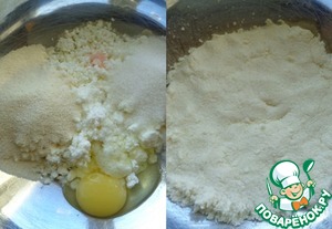 Приготовить творожную массу: в творог добавить сахар, соль, манку, яйцо. Перемешать. Дать постоять 30 минут, чтобы манка набухла.