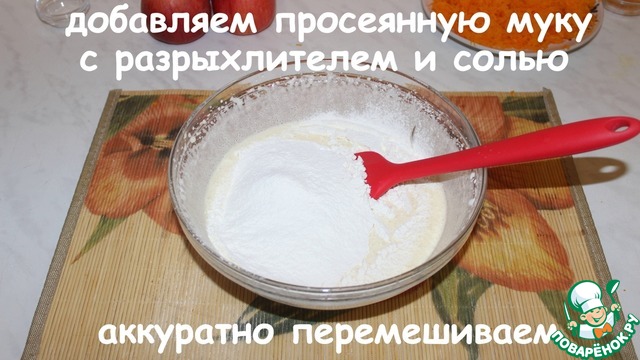Добавляем просеянную муку с разрыхлителем и солью. Аккуратно перемешиваем.