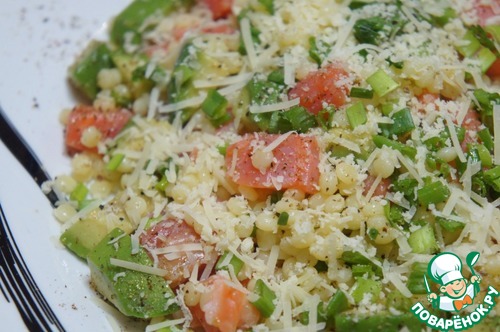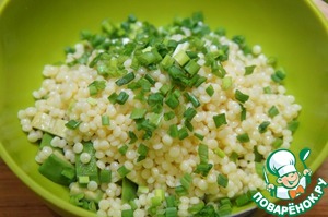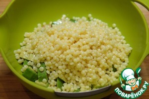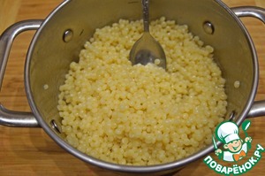 В кипящую подсоленную воду засыпать птитим, варить на медленном огне с закрытой крышкой 18-20 минут. Снять с огня, полить оливковым маслом, хорошо перемешать и дать остыть.
