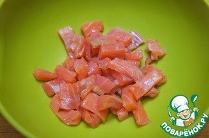 Соединить в глубокой миске лосось, авокадо и пасту.