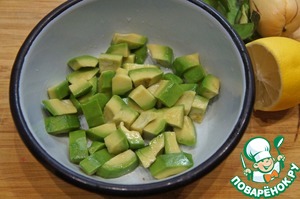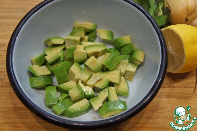 Из авокадо вынуть косточку, очистить его и нарезать кубиками. Сбрызнуть соком лимона, чтобы мякоть не потемнела.
