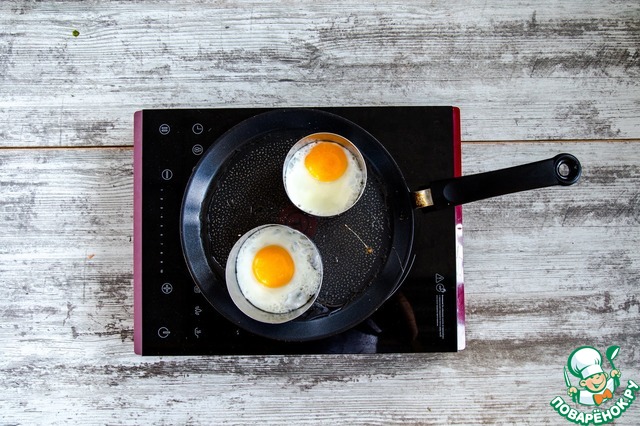 Добавьте в сковороду сливочного масла и пожарьте 2 яичницы-глазуньи (хорошо, если у вас есть силиконовое или металлическое кольцо – если установить его на сковороду, положить масло внутрь и аккуратно влить туда яйцо, то яичница получается идеально круглой и красиво ложится на булочку). Не зажаривайте сильно – яичница еще прогреется в духовке. Посолите и поперчите. -