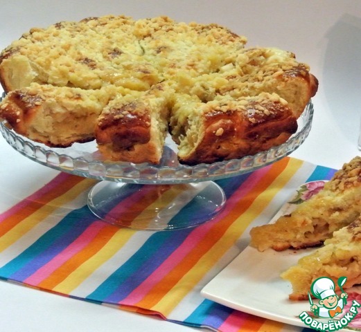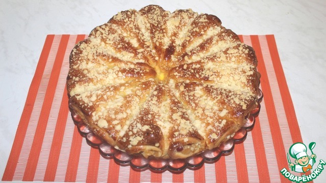 Выкладываем по кругу в форму. Прикрываем пленкой и даем подойти 40 минут. Подошедший пирог смазываем желтком.