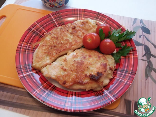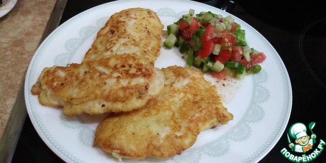 Подобные шницели ( с разными нюансами в составе и технике приготовления) я видела на сайте, но данный вариант - самый быстрый и без заморочек: положил в кляр (он же маринад) - вытащил - пожарил. Все! Еще одно блюдо для занятых хозяюшек.