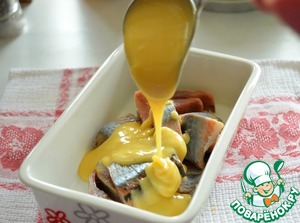 Сложите в контейнер нарезанную селедку, залейте её горчичным соусом, перемешайте и уберите в холодильник.