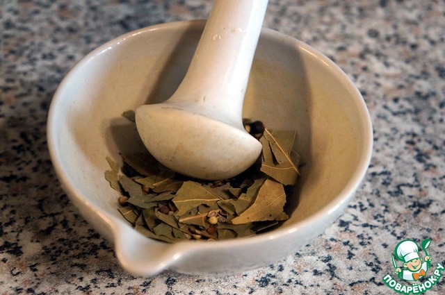 Подготовить специи. Зерна кориандра, перца кубеба и душистого, поломанные листья лавра потолочь в ступке.