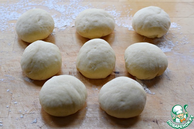 Выложить тесто на рабочую поверхность, присыпанную слегка мукой, обмять, разделить на 8 равных частей. (примерно по 75 граммов)