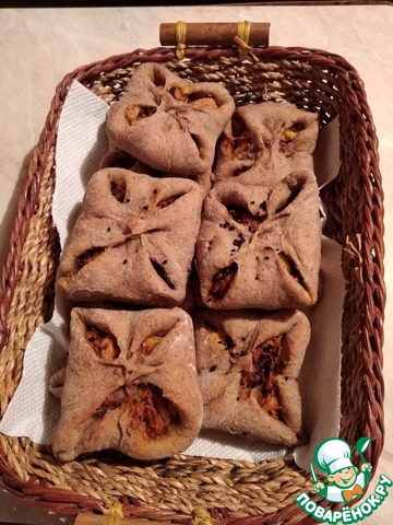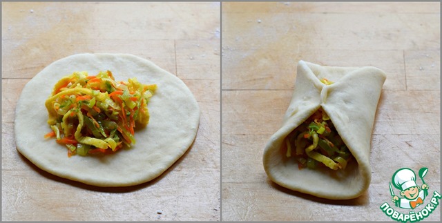 Каждую заготовку раскатать в в лепешку диаметром 13-14 см. В центр выложить полную столовую ложку начинки.
