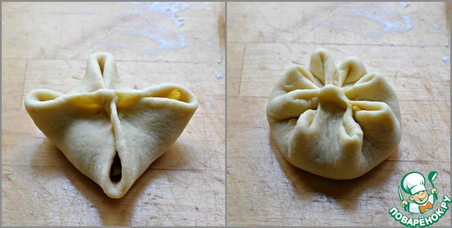 Затем нужно сформировать своеобразный цветок, скрепив края лепешки в центре с восьми разных сторон. Сначала две... -