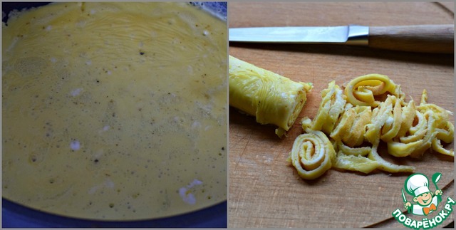 Два яйца взбить с щепоткой соли. Приготовить омлет. Нарезать омлет соломкой.