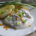 Апельсин помойте, снимите цедру и разрежьте пополам. Из половинки апельсина выдавите 1 ст. л. сока. Намнем приготовление соуса. Сметану смешайте с майонезом и добавьте сок.