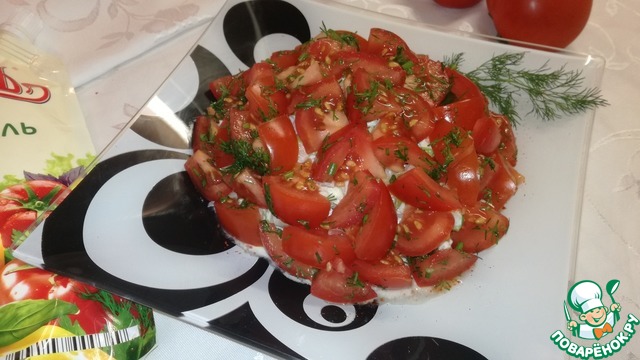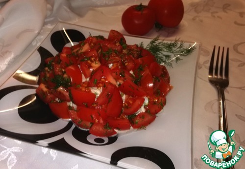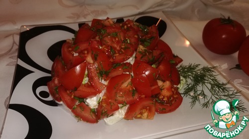 Сформировать из нашего салата небольшую горку. Выложить сверху помидоры. Готово.