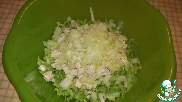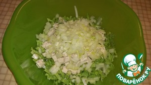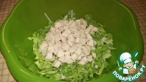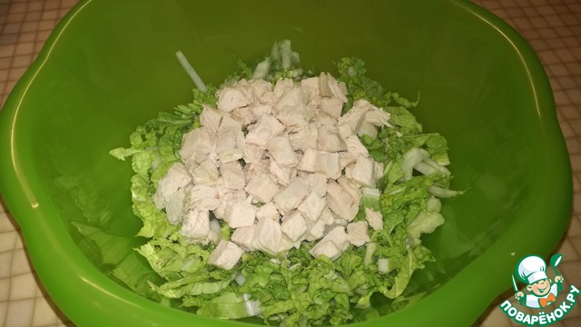Нарезать тонко пекинскую капусту. Высыпать в миску. Отварное куриное филе режем кубиками и отправляем к пекинской капусте.