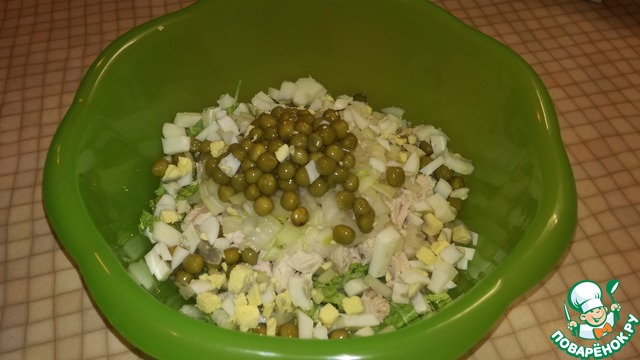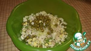 Мелко режем яйца и высыпаем в миску. Добавляем зелёный горошек.
