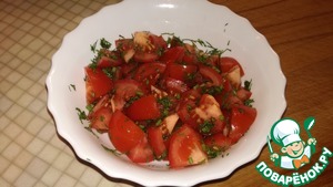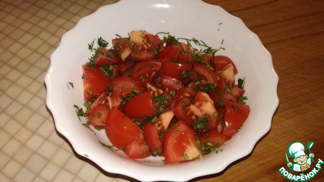 В отдельной миске режем небольшими кусочками помидор, к нему добавляем укроп, немного посолить и перемешать.