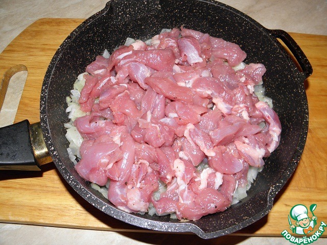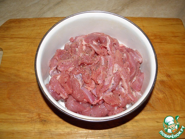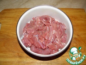 Мясо обсушить бумажными полотенцами, посолить, поперчить, дать немного постоять.