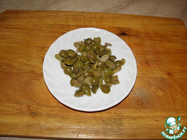Оливки нарезать кружочками ( в этот раз мне случайно попались с косточкой, поэтому пришлось резать по другому)))