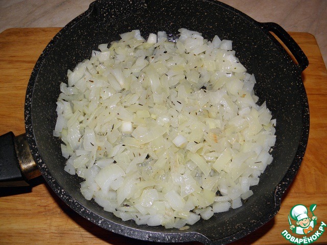 Лук очистить, мелко нарезать, у тимьяна (если свежий) удалить стебли, в большой сковороде с толстым дном растопить половину сливочного масла, положить лук с тимьяном и томить на слабом огне, помешивая, минут 10.