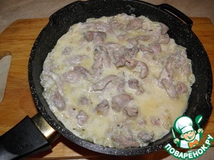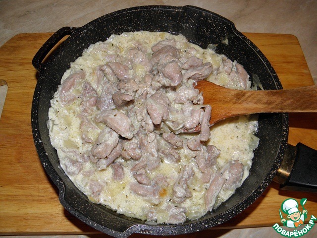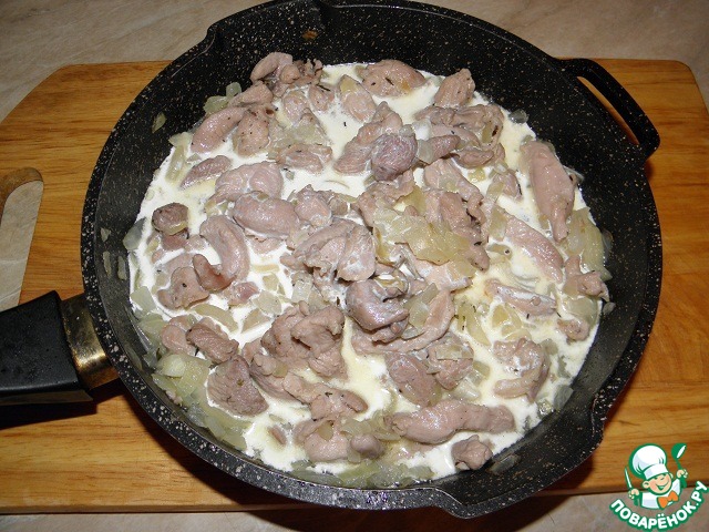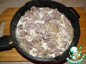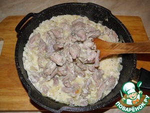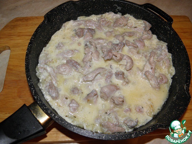 Влить сливки, довести до кипения, уменьшить огонь до минимума и томить 15 минут