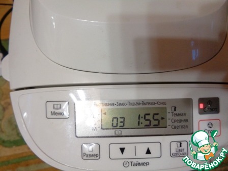 Установить ведро в корпус хлебопечки. Замес теста можно сделать вручную и выпекать в духовке, как только тесто увеличится в объеме после расстойки. Выбрать программу хлебопечки. У меня номер три "Основной быстрый" и размер хлеба "М", программа рассчитана на один час пятьдесят пять минут.