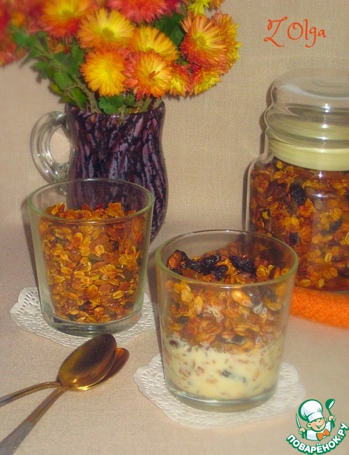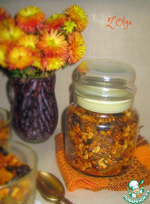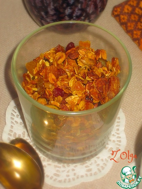 Для поднятия настроения в осенне-холодный период предлагаю на завтрак золотистую, ароматную гранолу из овсяных хлопьев, изюма, кураги, семечек и, конечно же, моей осенней любимицы - тыквы! Подаём с йогуртом, кефиром, молоком или хрустим просто так!